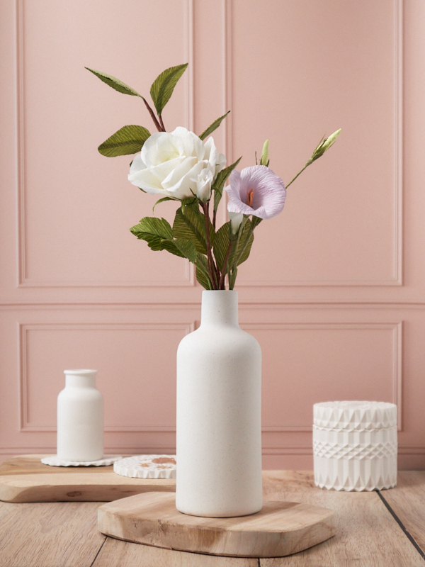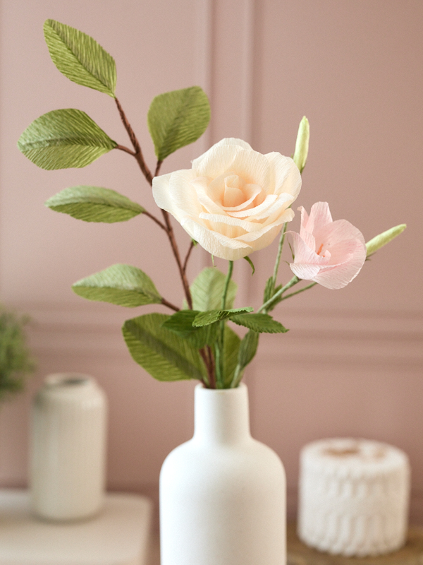 Chaque pétale et feuille est découpée et assemblée délicatement. Quelques pétales (Rose et lisianthus) sont légèrement teintés pour davantage de réalisme.
