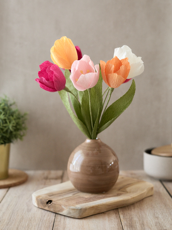 La tulipe, une jolie fleur de début de printemps, mais qui dure toute l’année quand elle est en papier crépon. 🙂